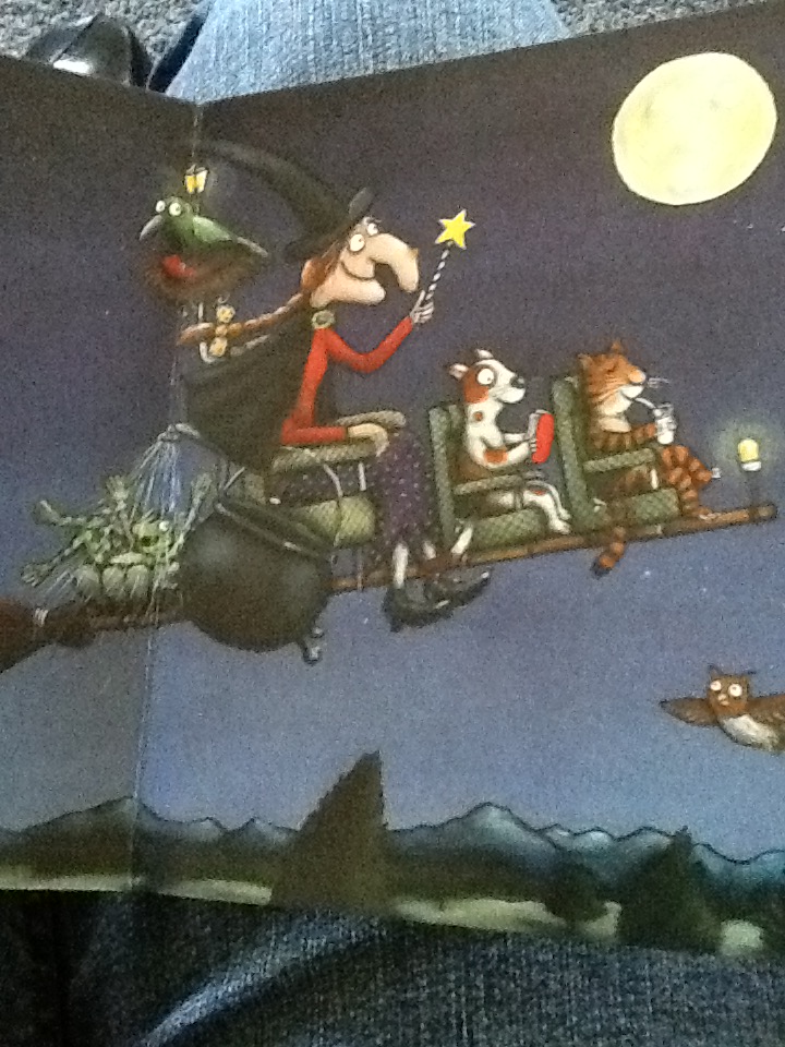 But after reading the book, Room on the Broom, my fears disappeared. For, as you can see in the above picture, a broom could have comfortable seating! And now, I’m happily thinking about it again. Even Buffy would have her own chair. And goggles. And a little brown bomber jacket.