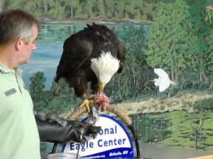 One of those eagles will be the guest of honor at the talk given by one of the on site naturalists.  As the volunteer stands by holding the eagle, well, let’s be honest here. He’s not really holding the eagle with the leather glove, The eagle is allowing the volunteer’s  arm inside that big leather glove and sleeve to be a resting place for those talons. That is really what is going on.