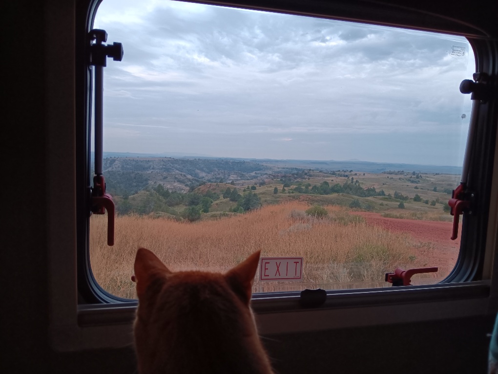 Here we are at the North Dakota Badlands. Buffy looking out of the camper window.